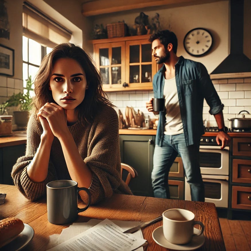 Eva sits at her kitchen table, fingers wrapped around a cooling mug of coffee, as her partner Marcus paces the room.